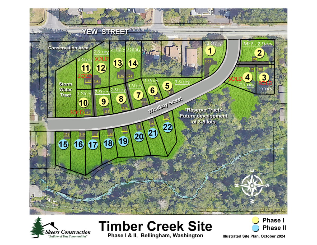In the heart of Bellingham, the new Timber Creek neighborhood places residents a short distance from downtown and a variety of trail networks, including the popular Whatcom Falls Park. With sidewalks on both sides of Whidbey Street and a future dedicated nature trail we’re making it easy for residents to enjoy the outdoors and foster a sense of community. Skeers Construction will be developing Phase One with 14 new homes in 2026. The Timber Creek neighborhood will have 22+ homes when completed.